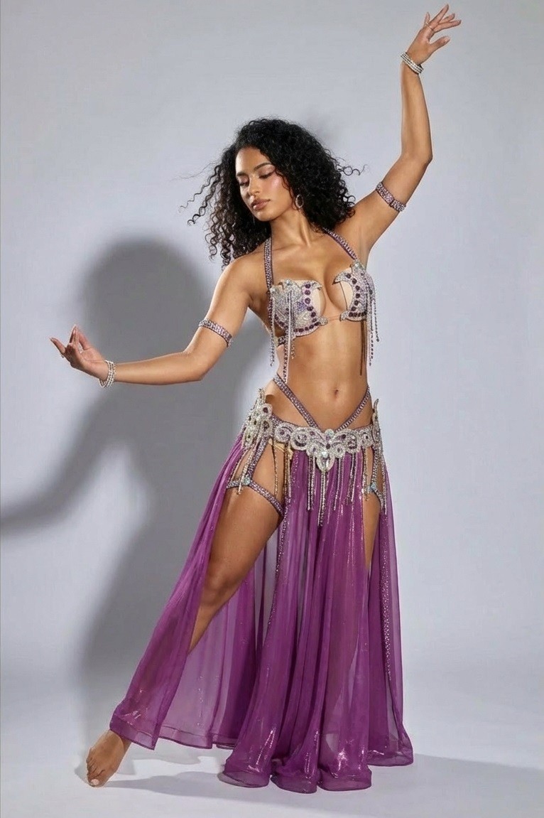 Shine on stage with the Belly Dance Costume, featuring a modern and elegant design that captures attention. Crafted from high-quality materials and adorned with sparkling crystals in stunning shades of purple and silver, this costume adds a touch of luxury and allure to your look. It features intricate details, including delicate straps and chic arm cuffs, offering flexibility and elegance with every movement. Perfect for professional belly dance performances or special showcases, this costume ensures you stand out with beauty and confidence.